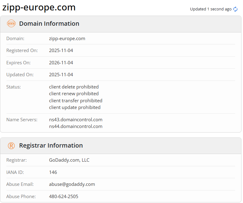 The domain zipp-europe.com was registered on November 4th, 2025, only two days ago. The site features a fake logo (likely AI-generated) and AI-generated text.